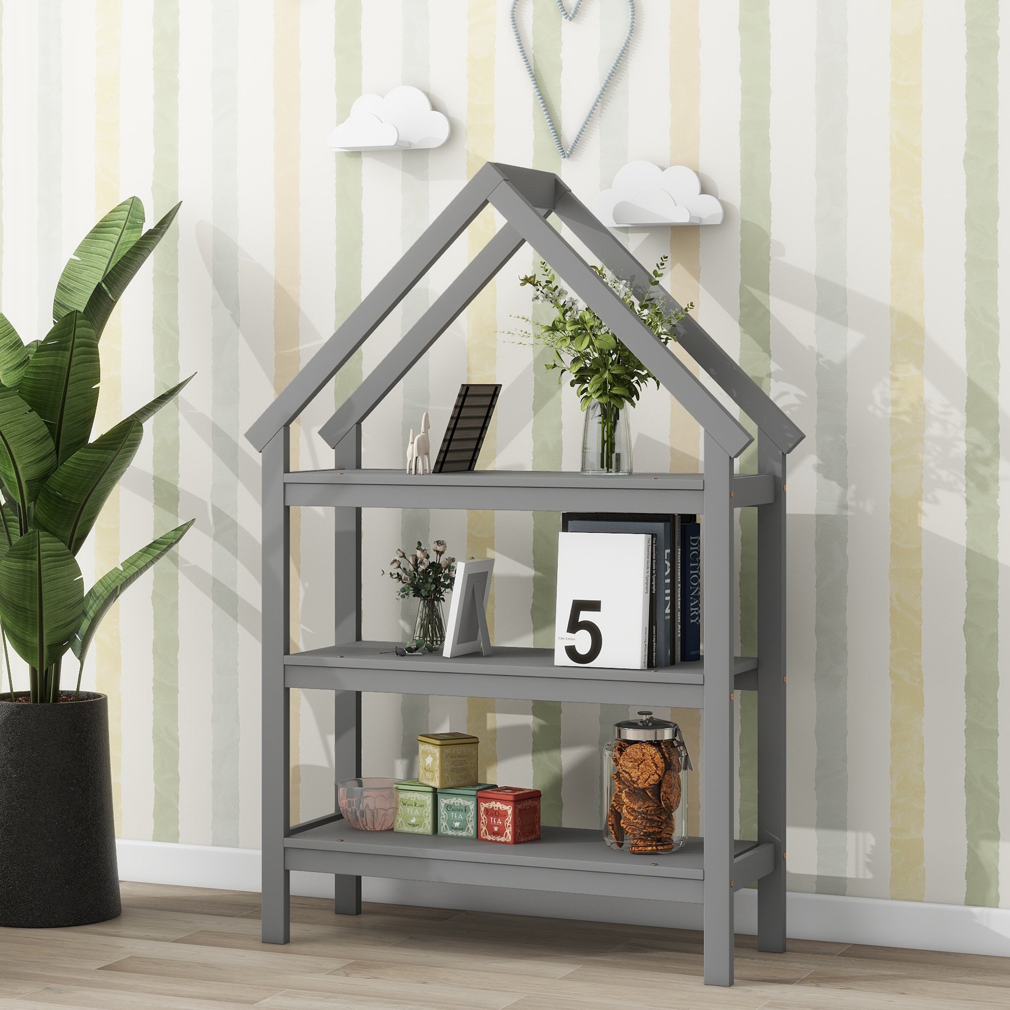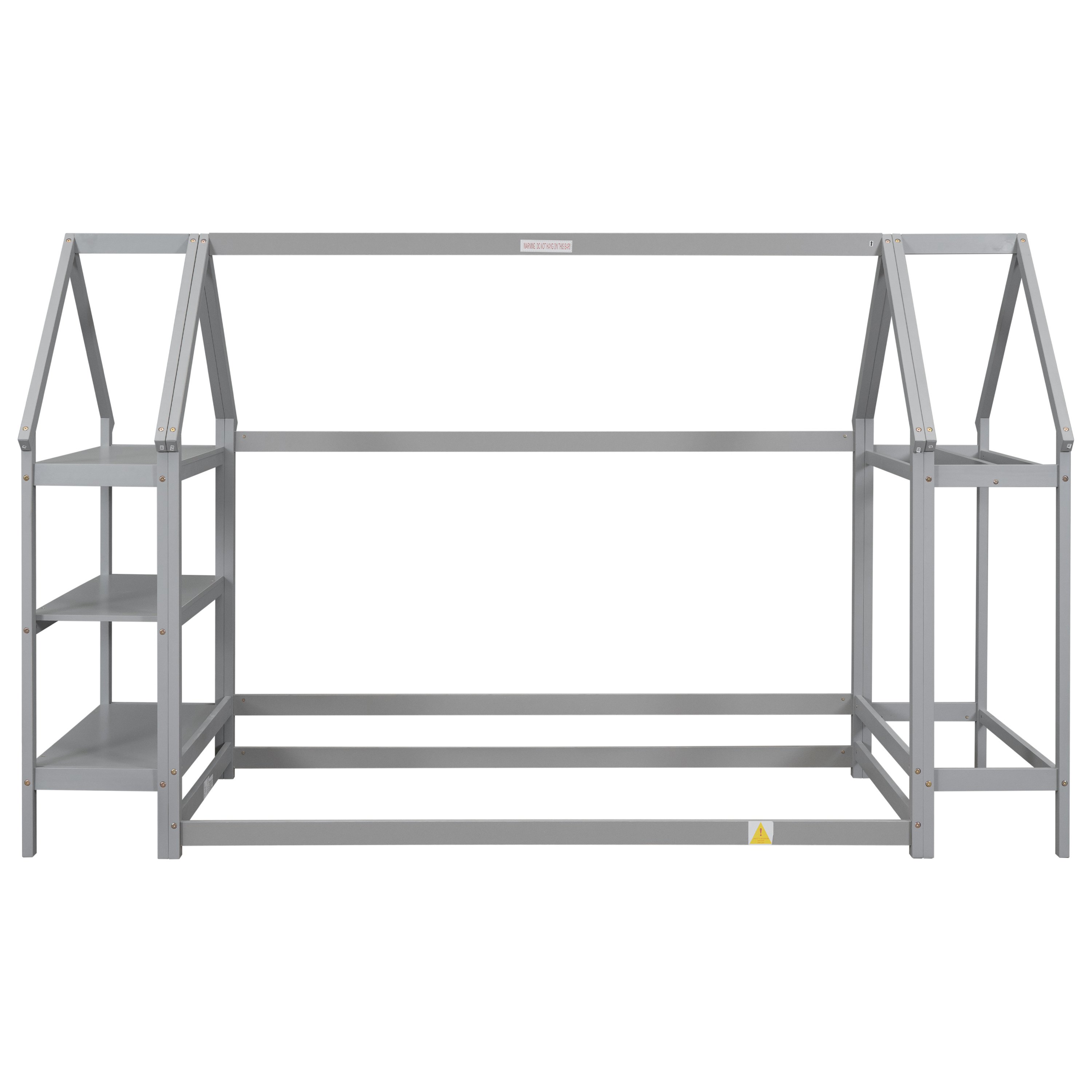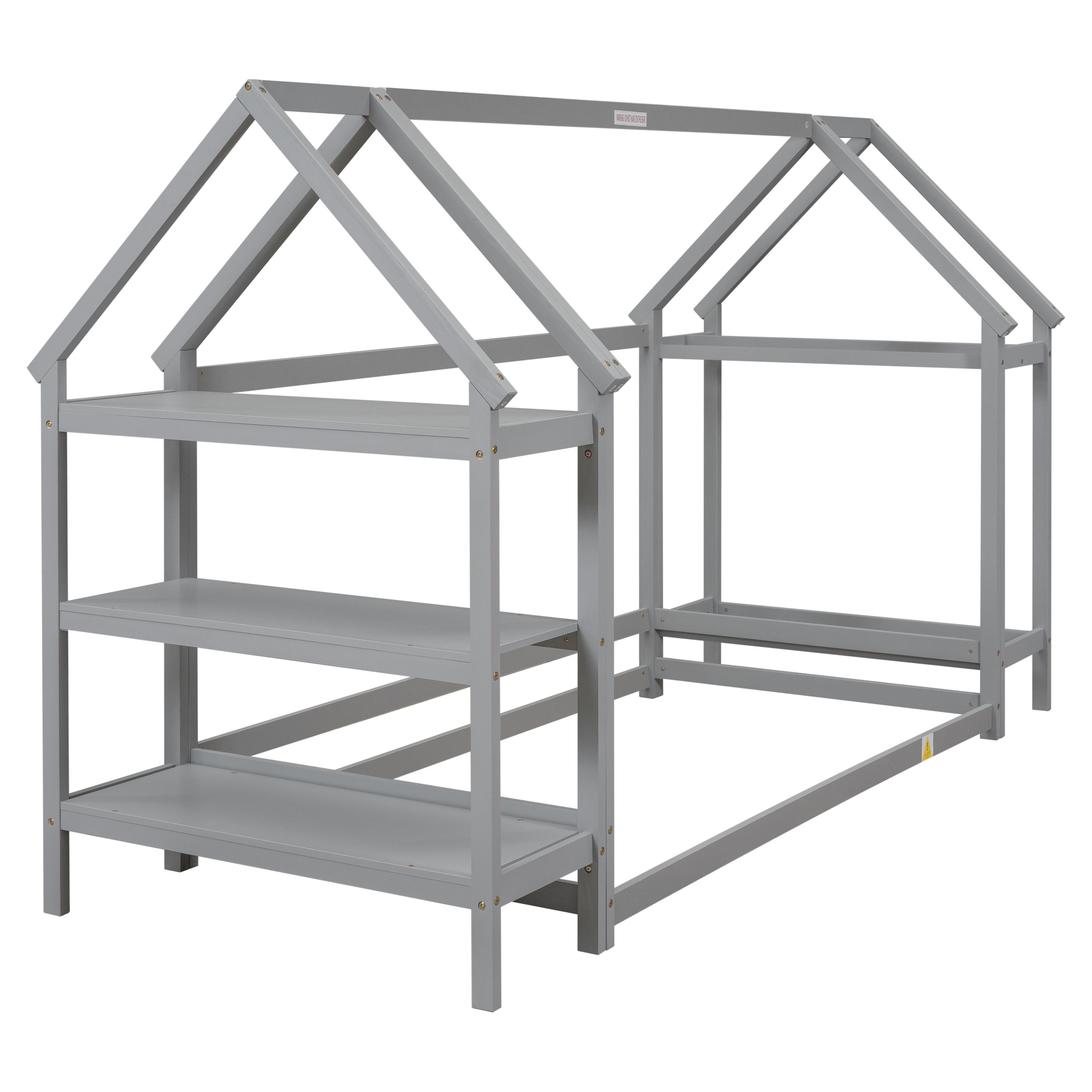Discover the perfect blend of functionality, comfort, and style with our twin house-shaped bed with two stands. This twin floor bed with stands has a lovely, interesting house style, featuring a wooden house-shaped roof frame structure to meet the desire of exploring the world, decoration and imagination, and ithas two stands for storage, hanging clothes and decoration.