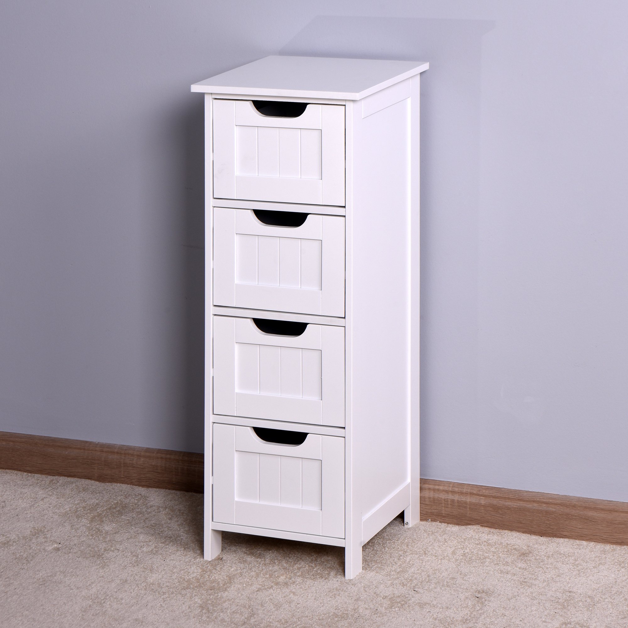 GOOD NEWS FOR SMALL SPACES: Still looking for extra storage for the tight corner in your bathroom? Well; this slim cabinet with 4 drawers can't wait to meet you; just check the dimensions and see if it fits; and the drawers' dimension is 10.6"L x 9.4"W x 4.3"HSEE THE BEAUTY IN SIMPLICITY: You can't deny that all-white cabinets bring a fresh and calm feeling to your bathroom; the clean lines and simple silhouette add elegance and can easily match your country styleSTABILITY BEFORE EVERYTHING: Crafted of high-strength fiberboard (P2 grade) and delicate details that enhance the stability; this cabinet promises a long service life; an anti-tip kit is included so you don't need to worry about kids tipping it overTICK ALL THE BOXES: Does this organizer only belong to the bathroom? Of course not; whether it's your living room; hallway; you can put it wherever you need it to restore a tidy space100% SATISFACTION GUARANTEE: We provides professional customer service before and after purchase; don't wait any longer and enjoy it now!